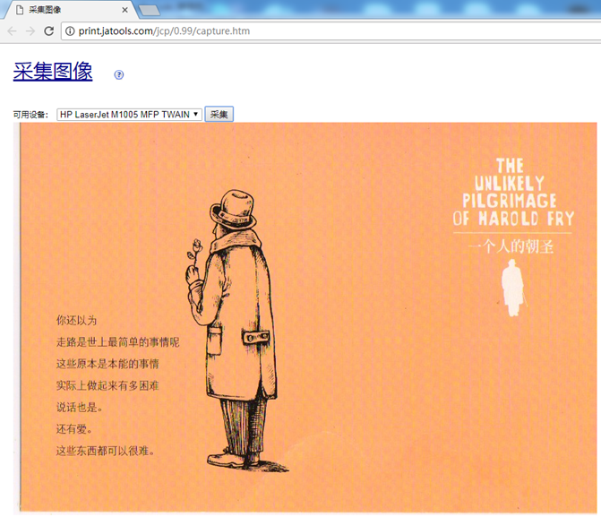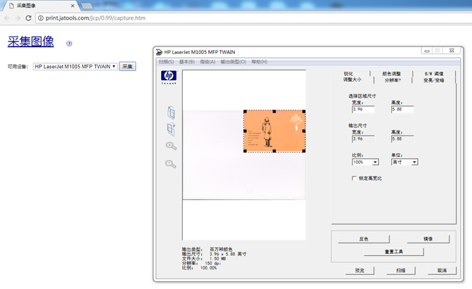 5.2 采集图像采集图像 1. var source = "HP LaserJet M1005 MFP";// HP 扫描打印一体机 2. getJCP().capture(source, function(result) { 3. if (result) { 4. // window.open(result); // 弹出一个窗口显示图片 5. myImg.src = result; // myImg 是一个 <img> 对像 6. } 7. })
